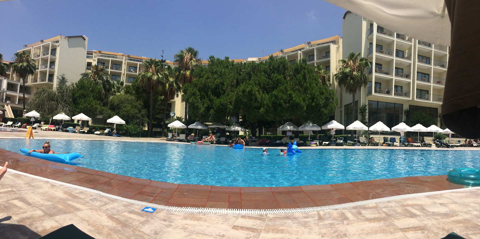 Blick von Poolbereich auf das Hauptgebäude