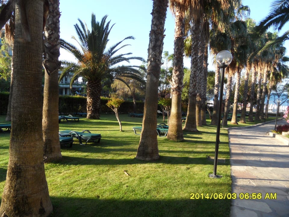 Liegeplätze unter Palmen, im Hintergrund das Meer