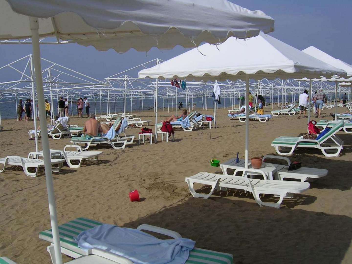 An Ostern waren noch nicht alle Schirme bespannt. Das geschah erst sukzessive. Im Hintergrund sieht man das Volleyballfeld mit durchhängendem Netz.
