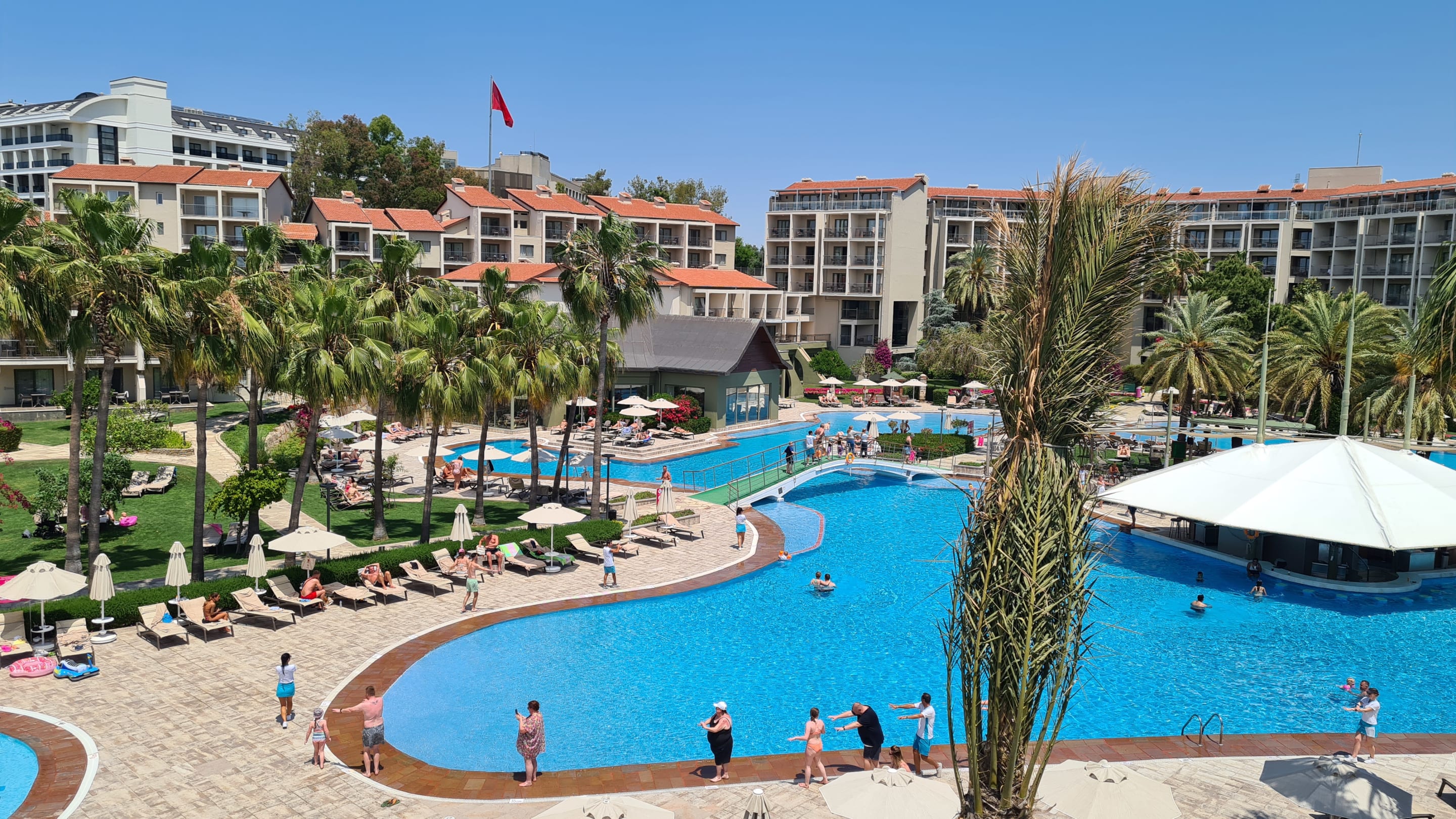 Blick vom Rutschenturm auf den Pool
