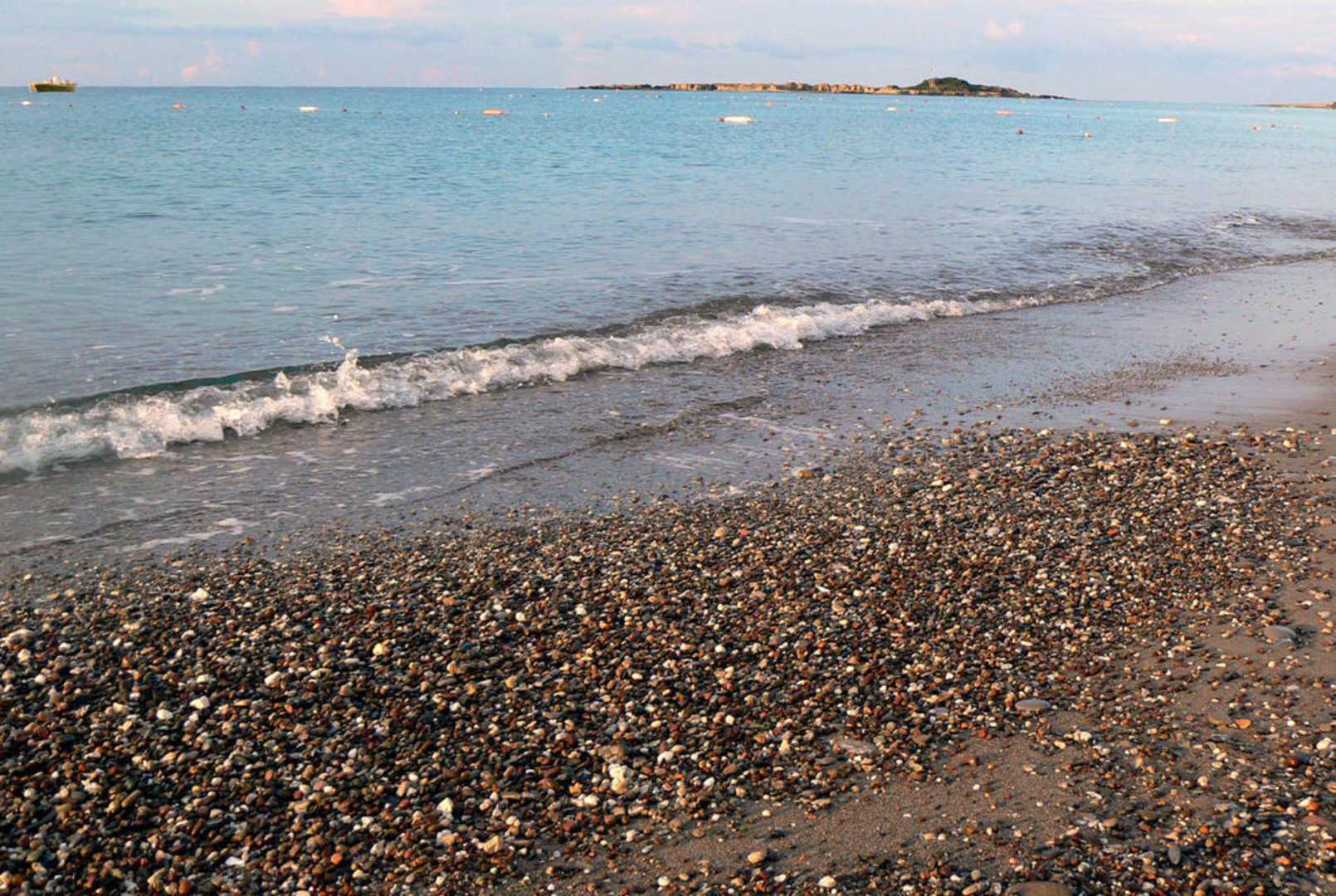 Der Strand am Hotel besteht überwiegend aus Sand.Wenn man jedoch ins Meer möchte, bleibt der Gang über den Kies nicht aus.