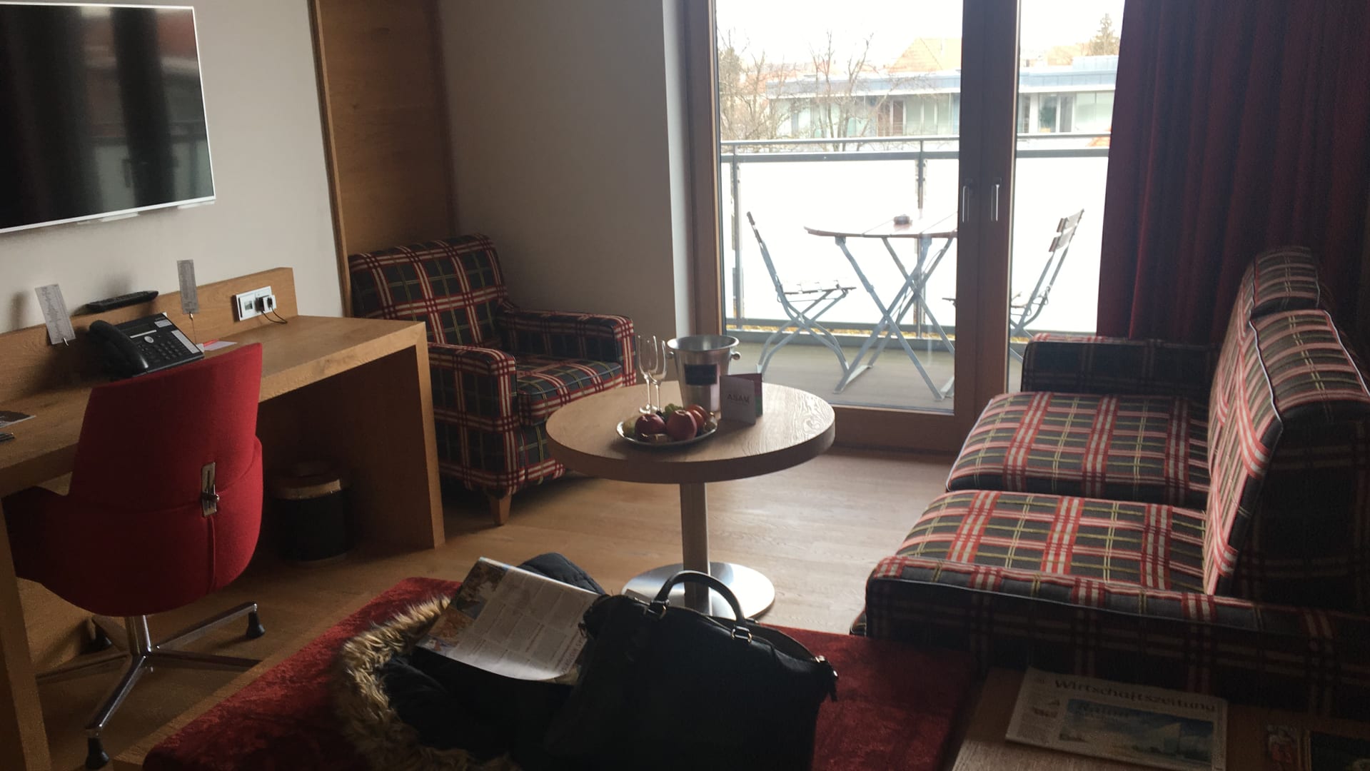 Wohnzimmer der Suite mit gemütlichem Sofa, Schreibtisch mit Stuhl, Flachbildfernseh
