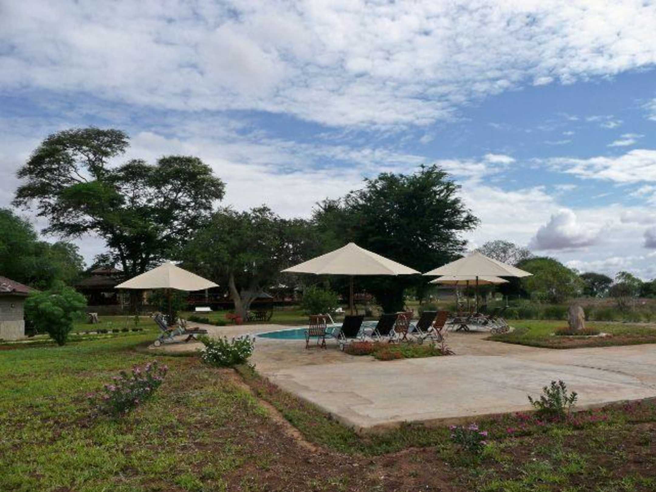 Ausblick auf den Pool und die Gartenanlage