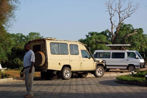 Safari-Fahrzeuge vor der Lodge