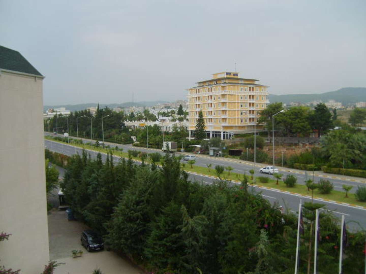 Blick nach rechts von unserem Balkon zur Autobahn. Das Fenster konnte man nicht offen lassen, da es durch die Autobahn sehr laut war.