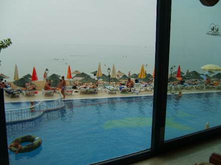 Ausblick von der Bar neben der Rezeption auf Pool und Strand