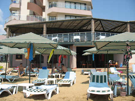 Blick auf Terrasse und Hotel