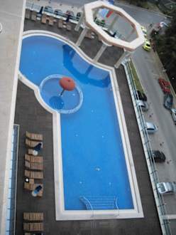 Blick vom 8. Stock auf den Pool im 1. Stock