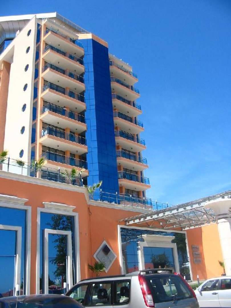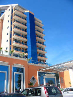 Hotel Asteravon der Straße aus fotografiert, links der Eingang zum Casino, oben drüber die Sonnenterasse mit Pool.