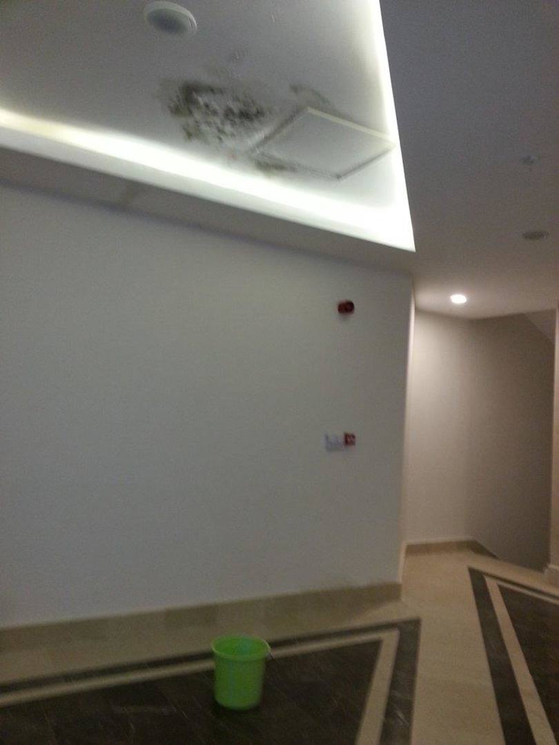 Wasser und Schimmelbildung mit Eimer im öffentlich