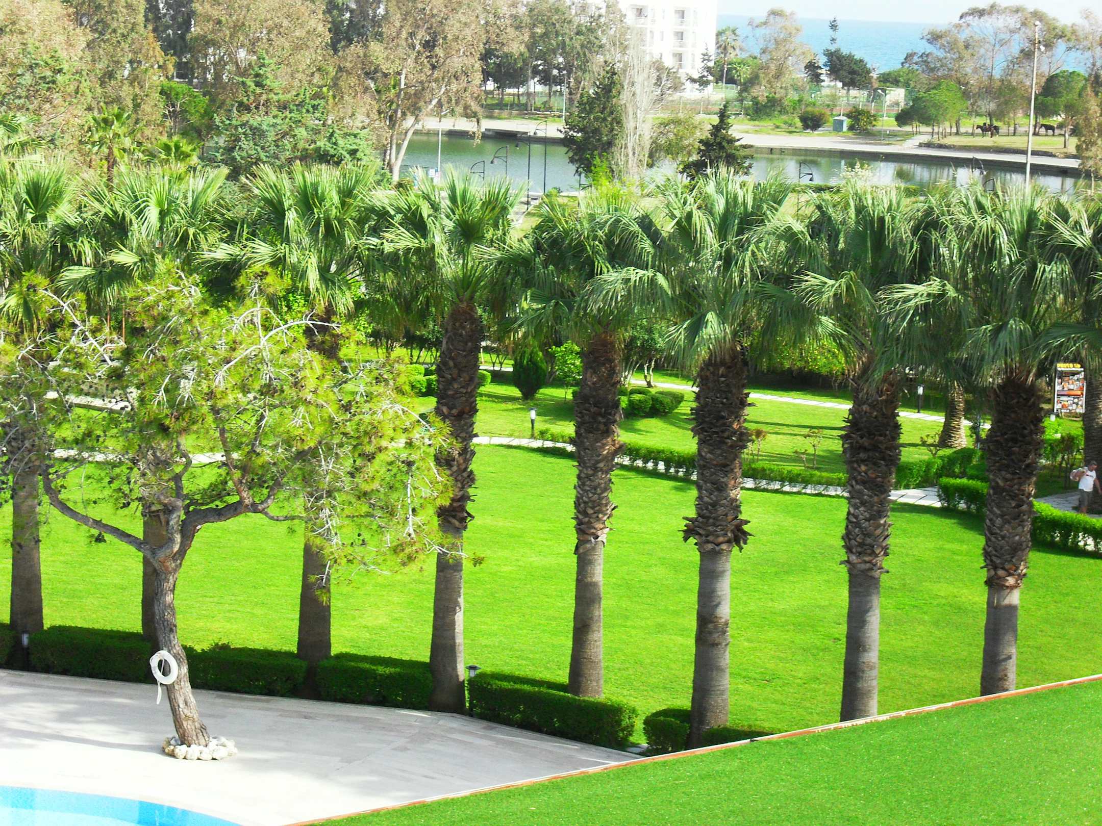 Blick duch die Palmen auf den See