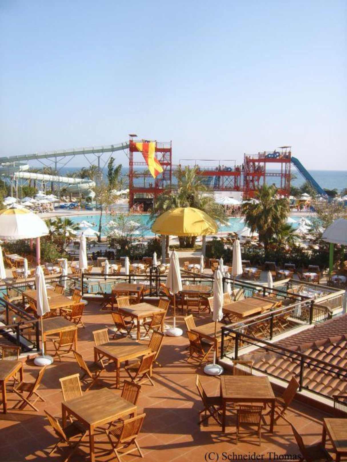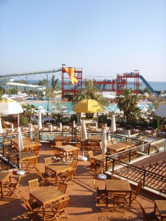Terrasse des Magico Restaurantsmit Blick auf den Aquapark