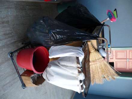 Das ist der Servicewagen mit dem das Personal zur Reinigung der Zimmer kommt. Ich habe leider nur einen Eimer und Lappen für das Zimmer, Bad und WC entdecken können. Ist das richtig?