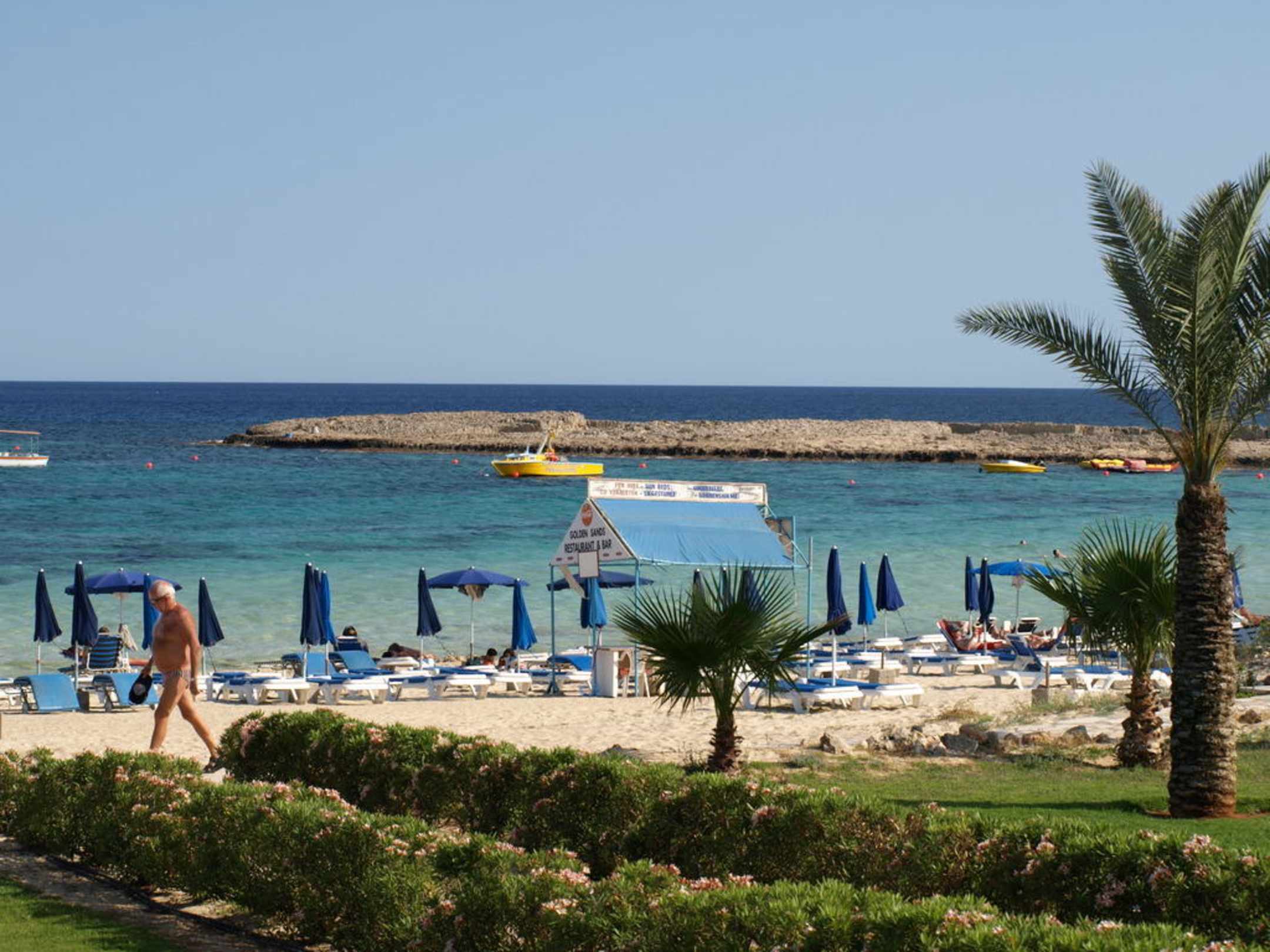 Blick von der Poolbar zum feinen Sandstrand