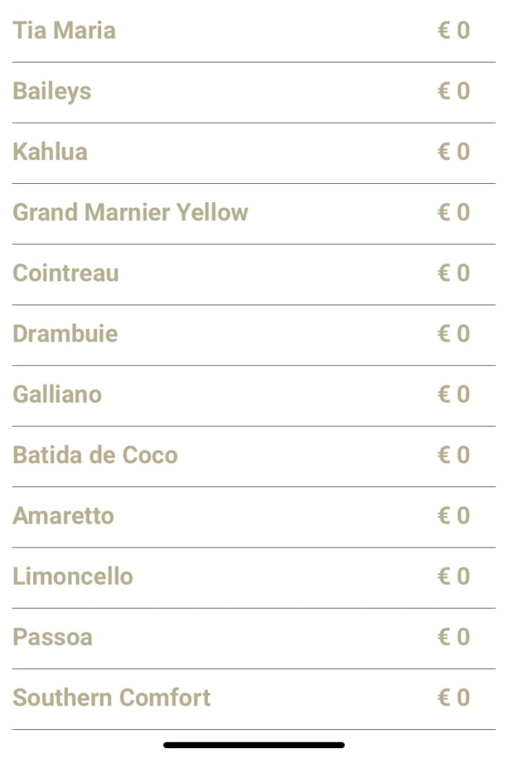 Cocktail-Liste aus der App. Besonders toll an der Sirens Bar : passende Gläser, Dekoration.
