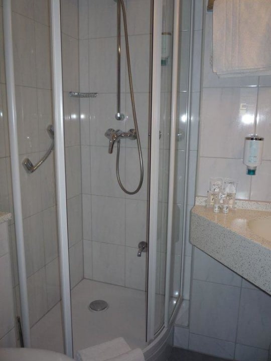 Badezimmer mit Dusche, Fön, Kosmetikspiegel.