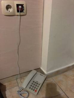 Anstat ein Tischen steht das Telefon auf dem Schmutzigen Boden