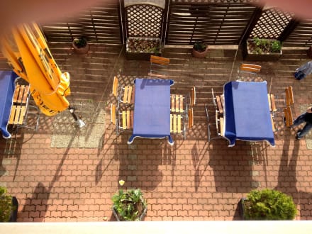 Direkt unter den Fenstern, es darf geraucht werden.