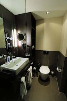 Duschbad mit WC. Zimmer 523Bad mit allem Komfort und schicken Eichenholzmöbeln. Foto Jens Bodenstein www.sailerpix.de