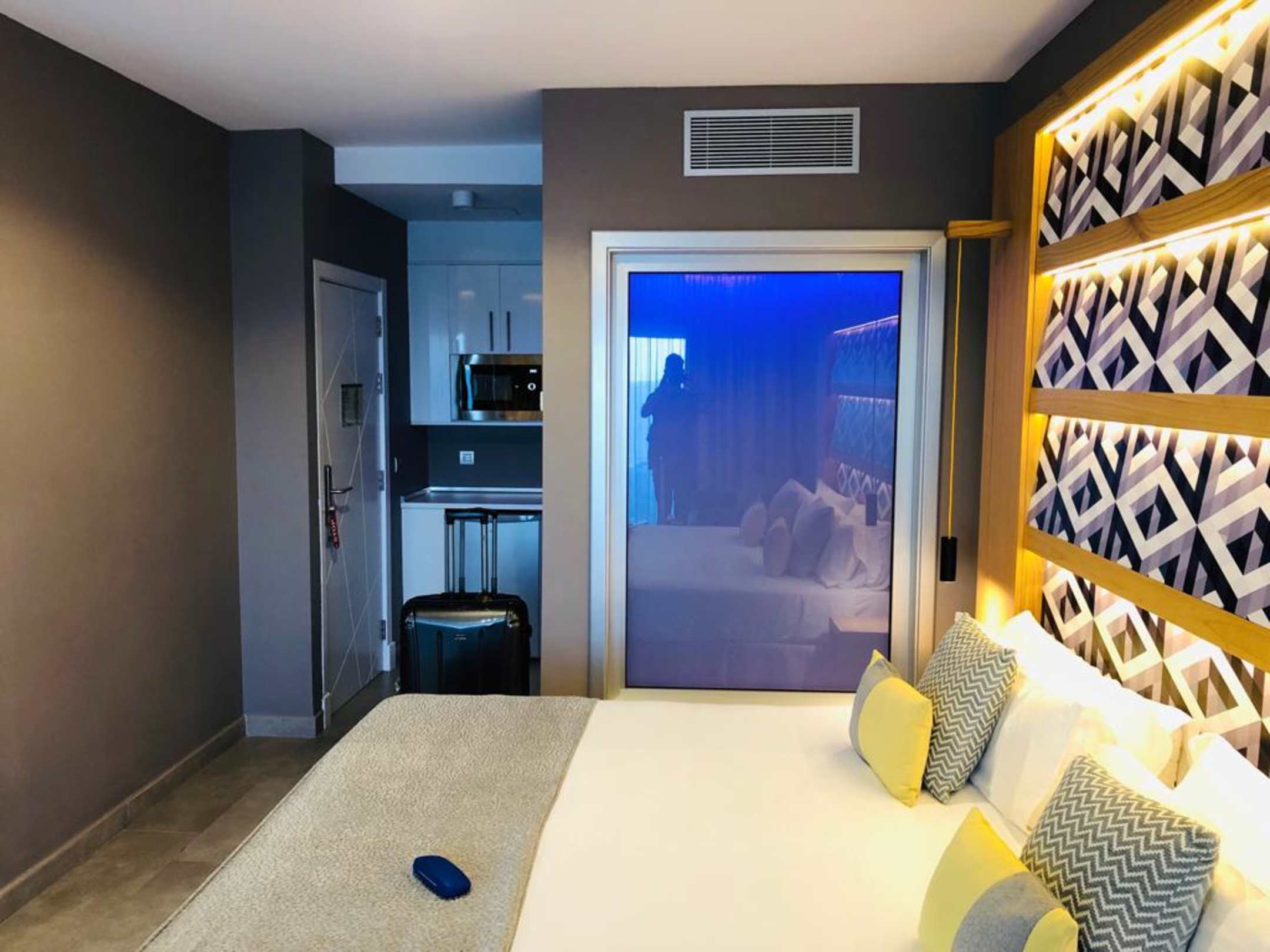 Zimmerblick vom Balkon aus mit Blick auf die Milchglas Dusche.