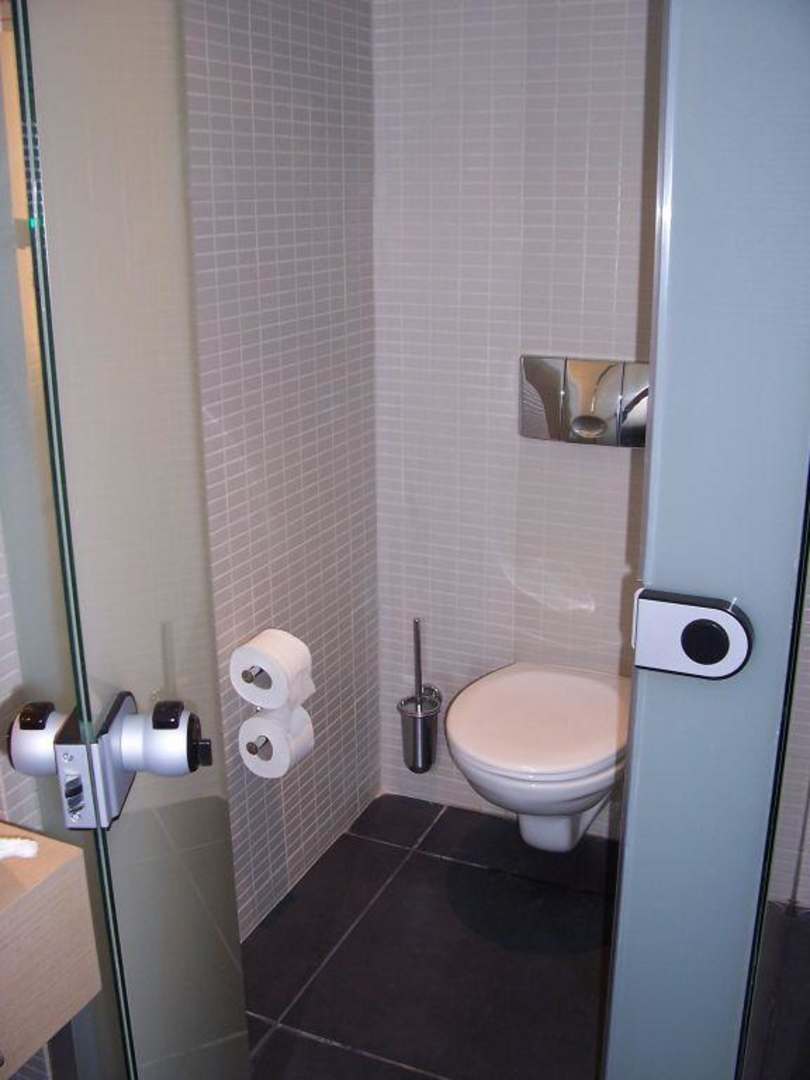 Die Toilette ist durch eine Glaswand und eine Glastür vom Badezimmer abgetrennt.