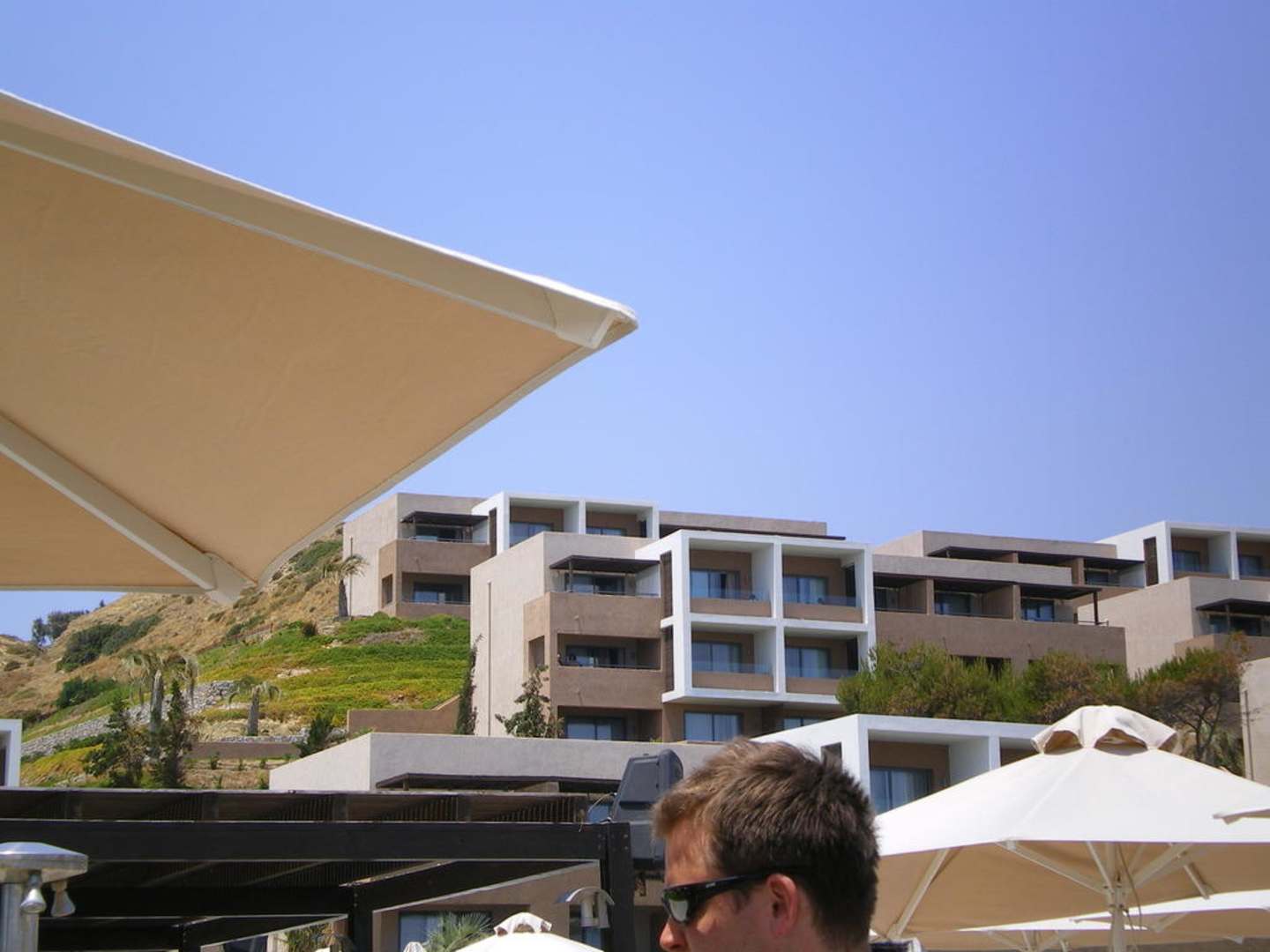 Blick vom Pool auf die Zimmer