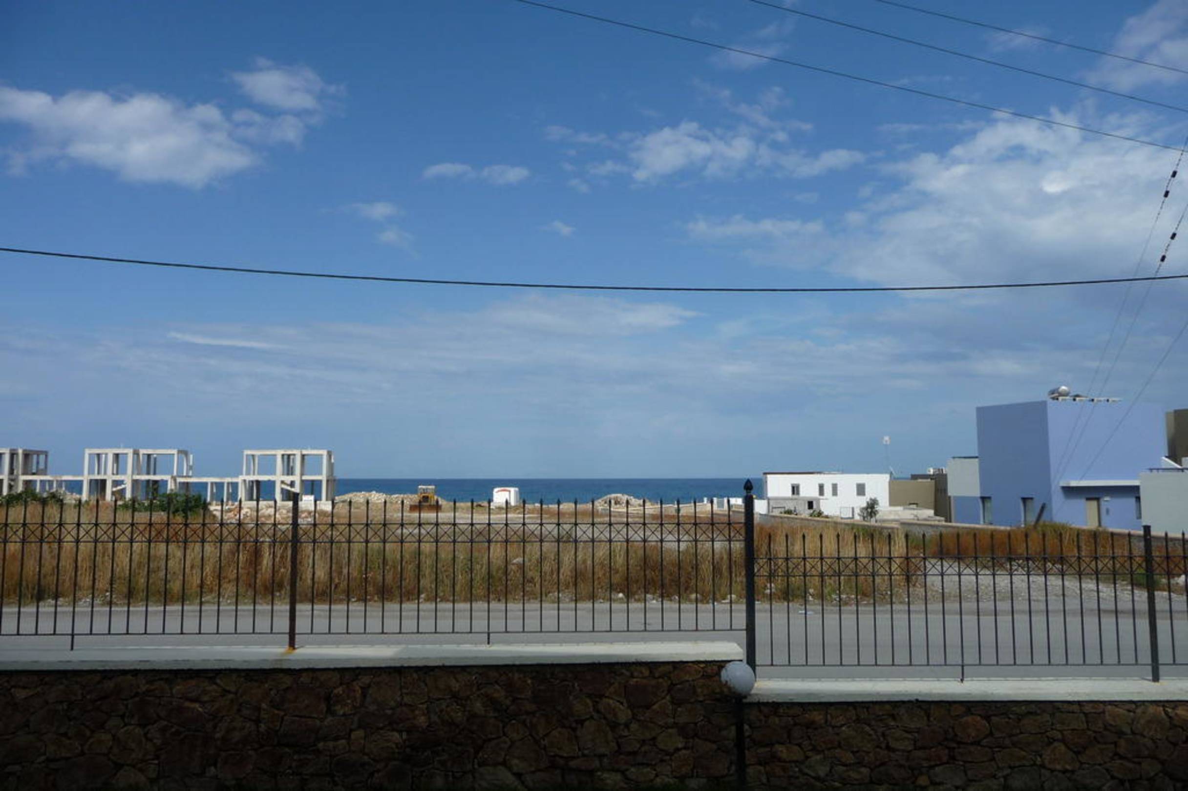 Der "tolle" Meerblick von der Terrasse des Zimmer 101, gleich nach dem Zaun die Küstenstraße von Kolymbia, danach Brachland mit Baustelle und verrosteter Raupe und dann ein bisschen Meer