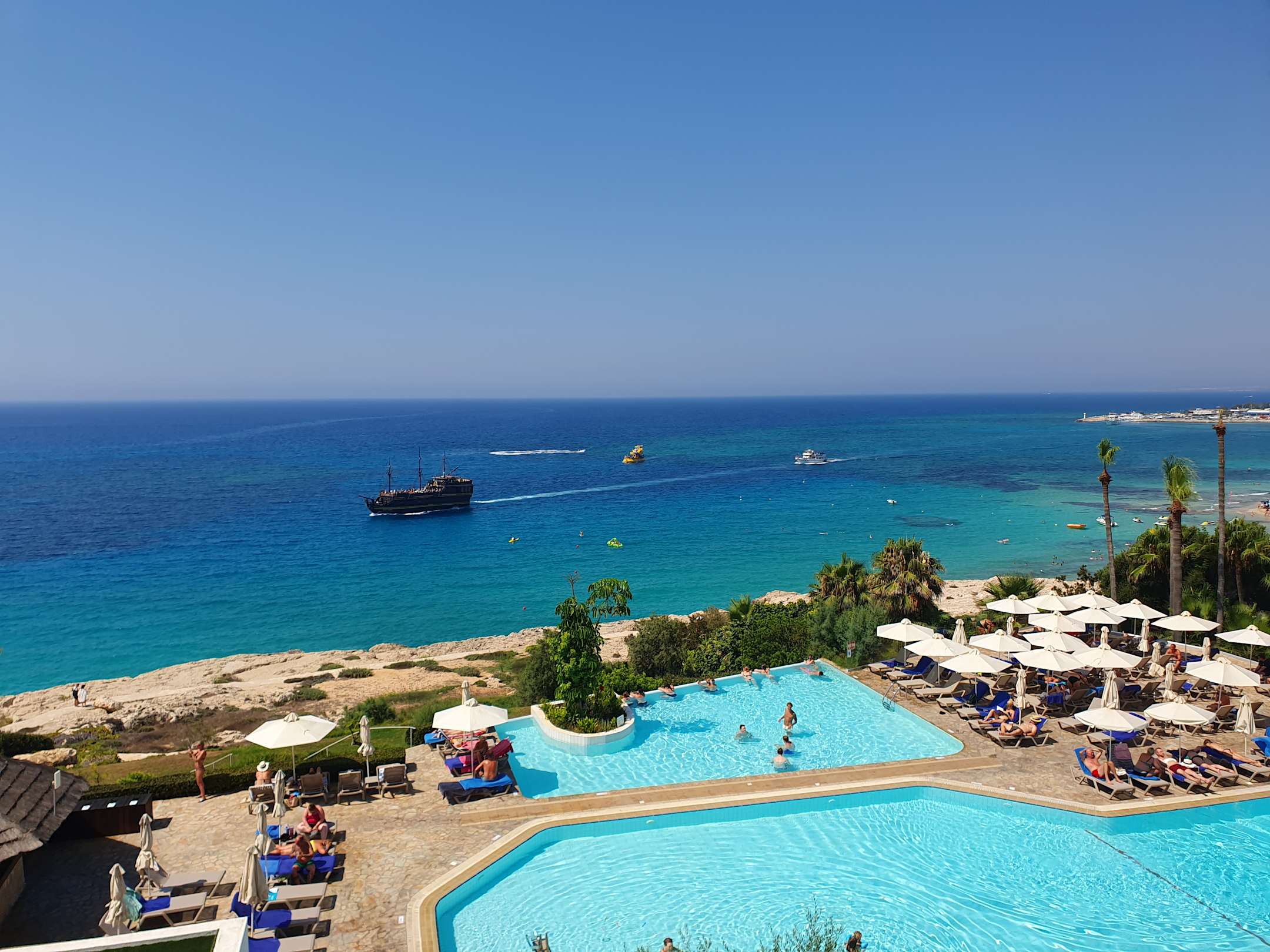 Blick von der Rezeption über die untere Poolanlage