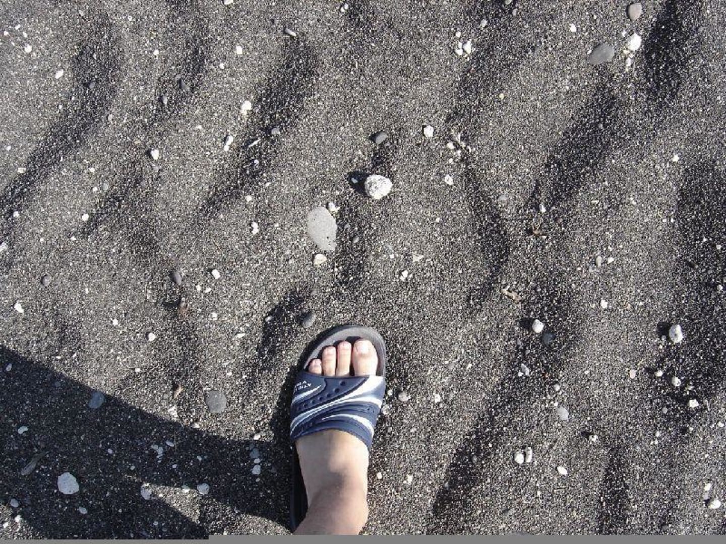 Im Sommer sollte man Badeschuhe anziehen, weil der Sand/Kies sehr warm werden kann.