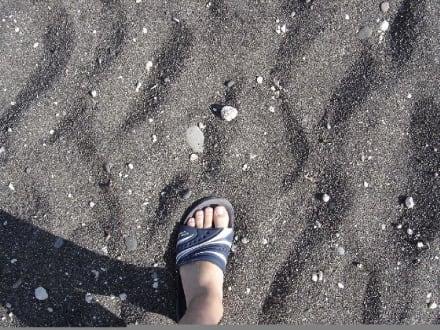 Strand ist grobsandig bis feinkiesigDer Strand aus meist dunklen, vulkanischen Gesteinsgeröllen ist direkt am Hotel hauptsächlich grobsandig bis feinkiesig (Komponenten sind 0,6 cm bis 6 mm groß).