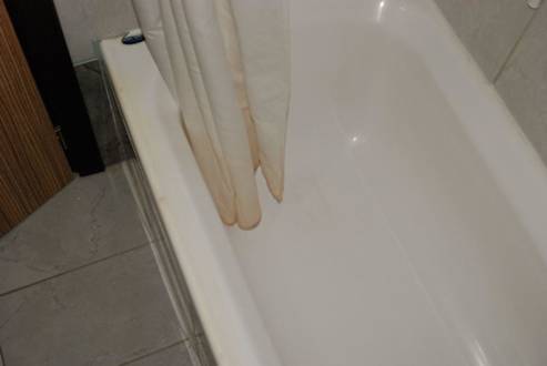 Wanna i okoliceWstrętna zażółkła firana, pomazany farbą brzeg wanny i urypany silikon przy wannie. To hotel a nie podrzędny akademik.