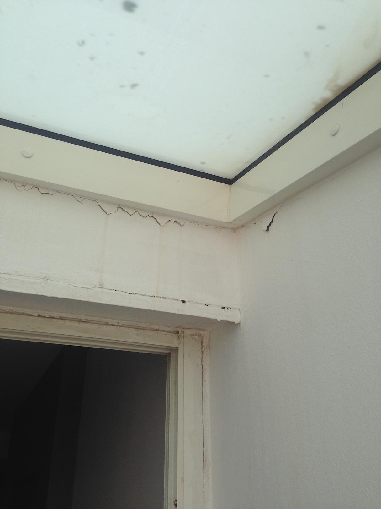 Überdachung Balkon teilweise blättert die Wandfarbe ab.
