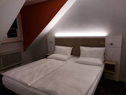 ZimmerUnser Doppelbett und links die gefährliche Dachschräge für die Nacht, wenn man aufs Klo muss und nicht daran denkt ;-)
