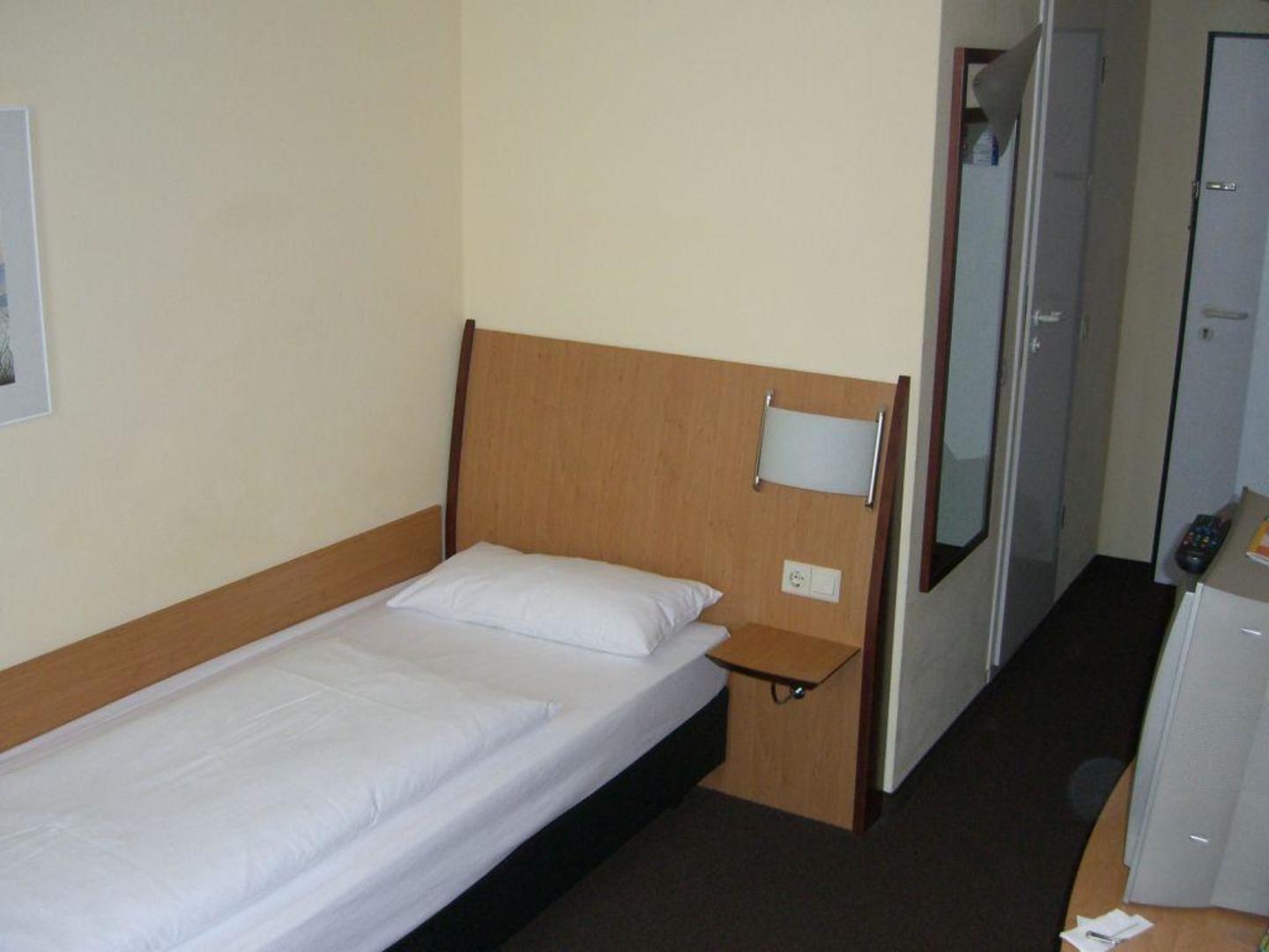 EZ im Atrium Hotel München. Auf der linken Seite hinter dem Bett ist der Eingang zur "Naßzell", dem kleinen Bad. Rechts sieht man das TV-Gerät, daneben befindet sich der Schreibtisch.