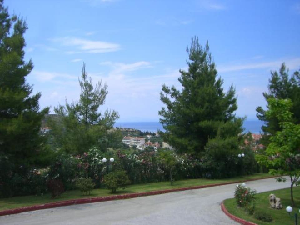 Heir der Blick von unserem Balkon aufs Meer im Hintergrund sowie das Dorf.