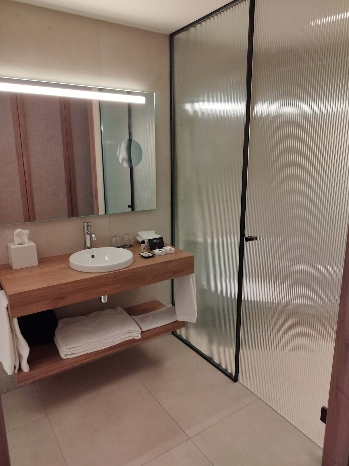 Waschbecken in der Mitte. Links davon Dusche und rechts davon das WC