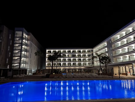 Der beleuchtete Pool und das Hotel
