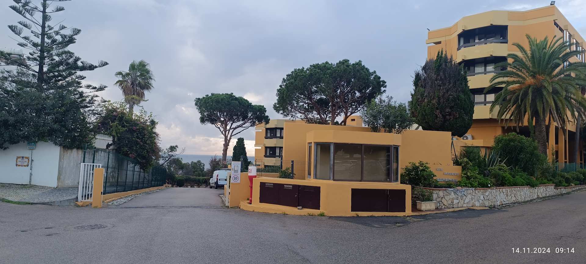 Links neben der Hotelgarageneinfahrt gehen gepflasterte Stufen zu einem kleinen Sandstrand.