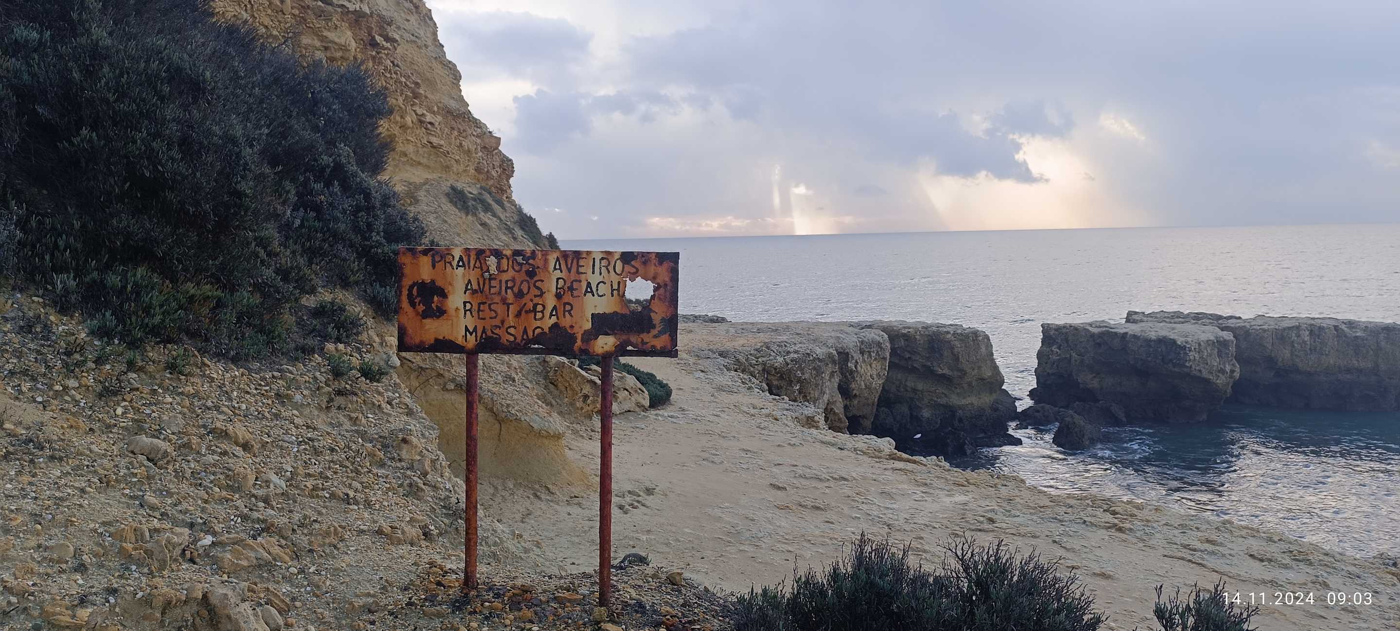 Älterer Wegweiser zu einem Strandrestaurant
