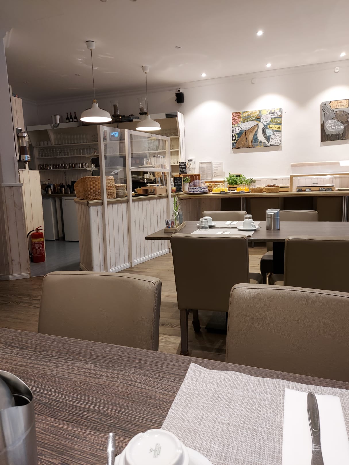 links die Ausgabe für Kaffee, Brötchen, Eier,...