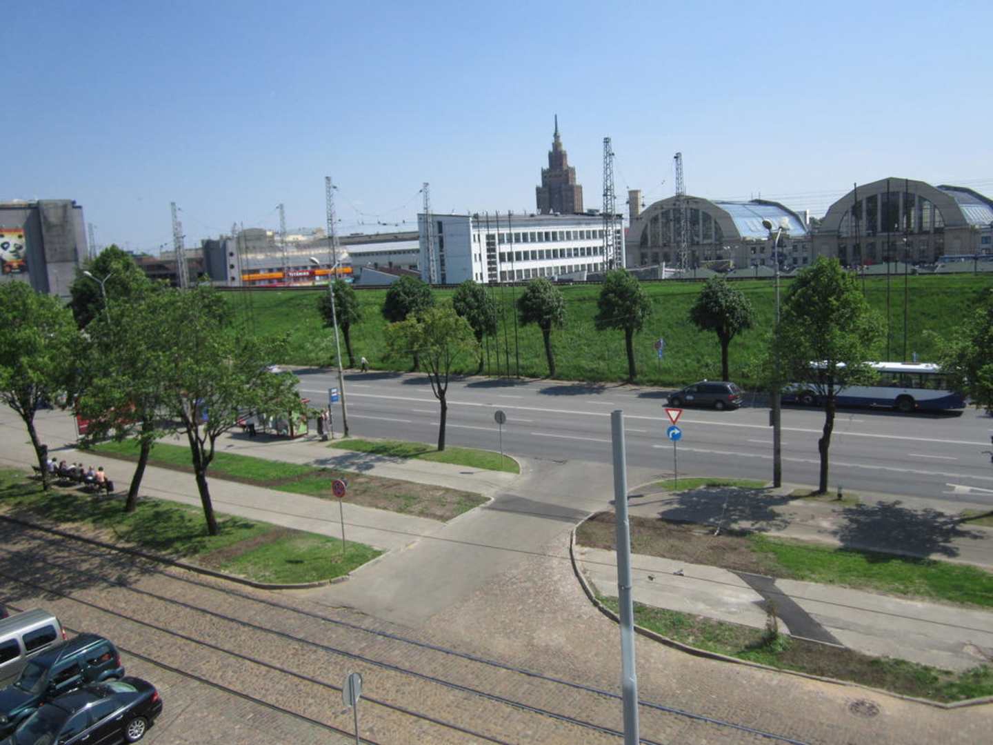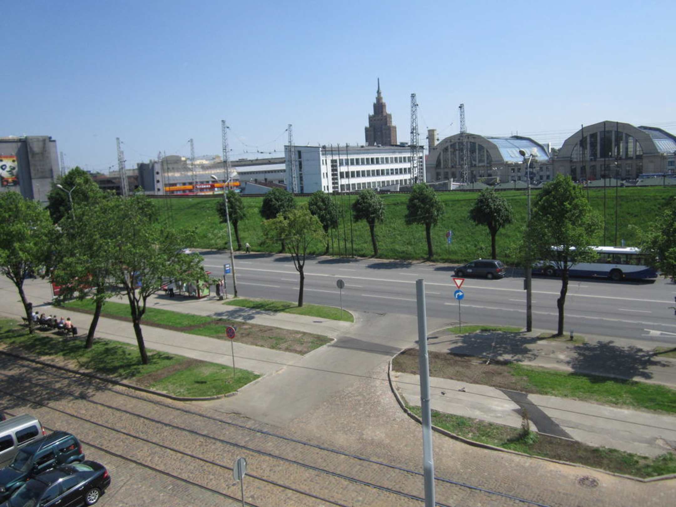 Die Kamera habe ich seitlich aus dem Fenster gehalten. Denn ganz öffnen lassen sich die Fenster im Hotel leider nicht. Hinter dem begrünten Bahndamm der Markt von Riga und der Kulturpalast.