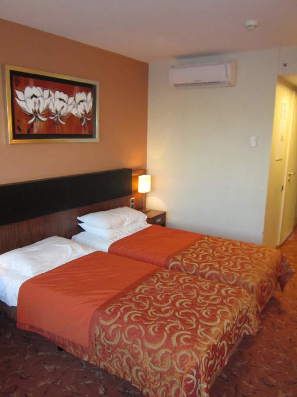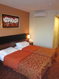 Die Betten (2 getrennte Einzelbetten)Die Betten waren besser als ich gedacht hätte. Am Schlafkomfort gab es nichts auszusetzen. Das Rückenteil zum hinsetzen mit Leder bezogen. Rechts oben ist die Klimaanlage sichtbar. Leider über dem Bett angebracht.
