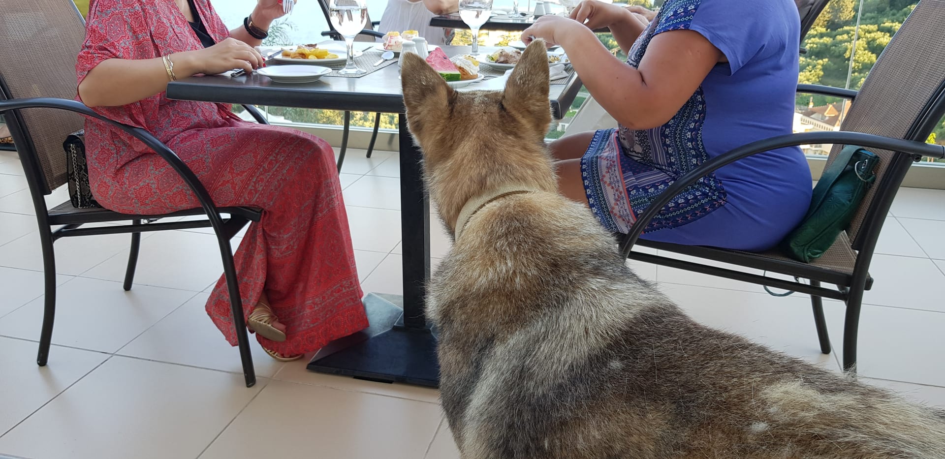 Schäferhund bettelt die Gäste an beim Abendessen