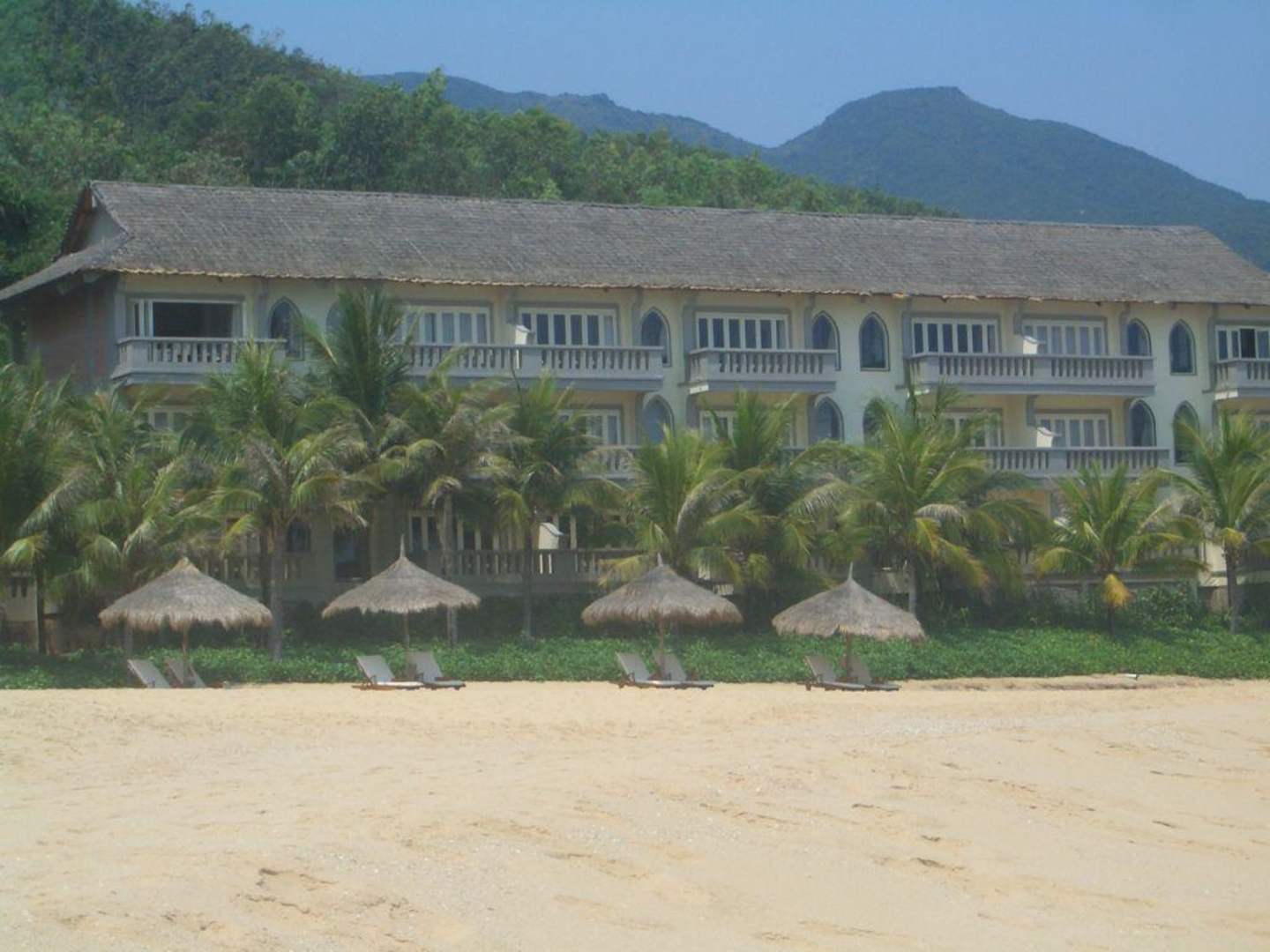 das 2 stöckige gebäude des resorts mit den strandliegen davor