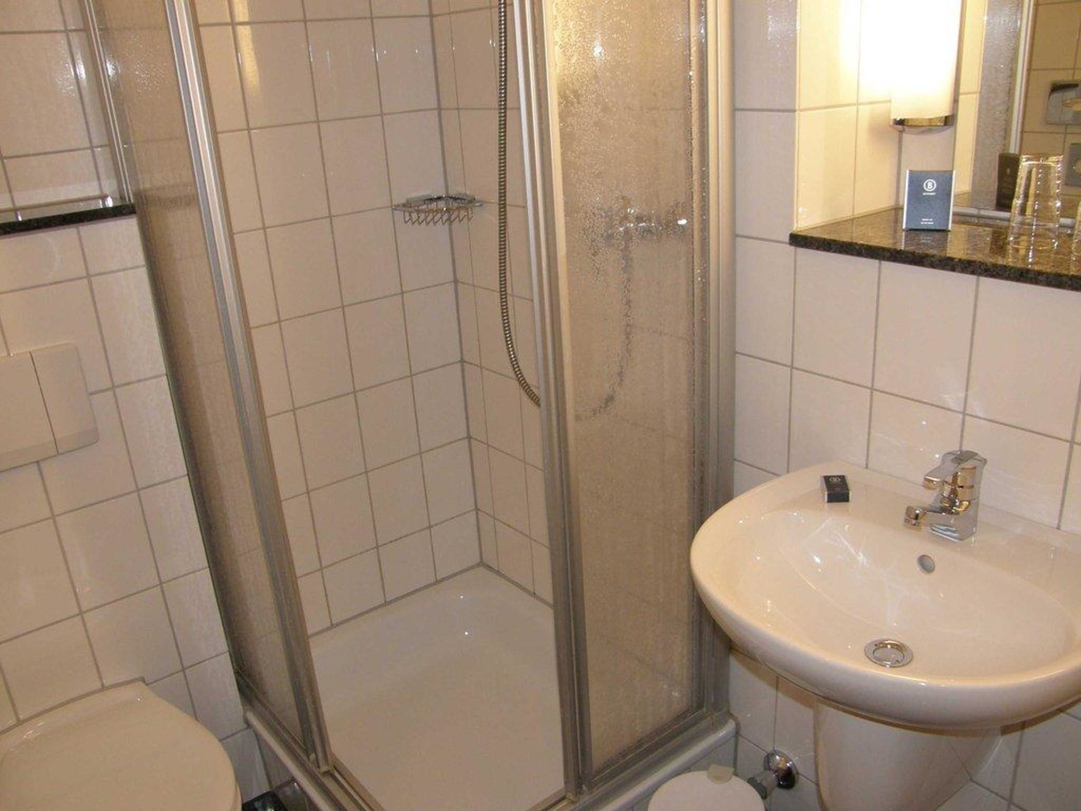 Badezimmer eines Superior-ZimmersAnsprechend und bis auf die etwas enge Dusche funktional eingerichtet