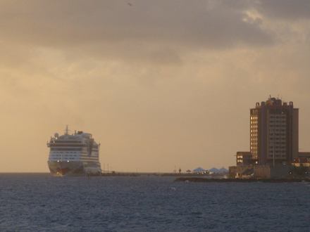 Blick auf den Anleger von WillemstadFast jeden Tag kann man riesige Kreuzfahrtschiffe beobachten vom Turm des "Blues Wing" aus