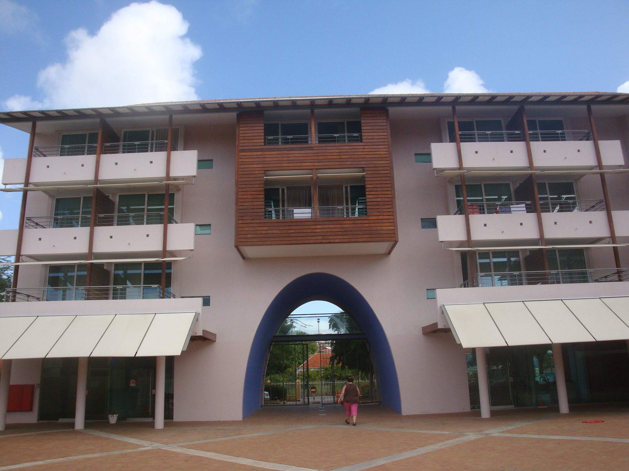 Ein Teil des OctagonwingUnten eine Geschäftszeile, oben die Zimmer und dazwischen das Tor zu dem der Penstraat vorgelagerten Parkplatz