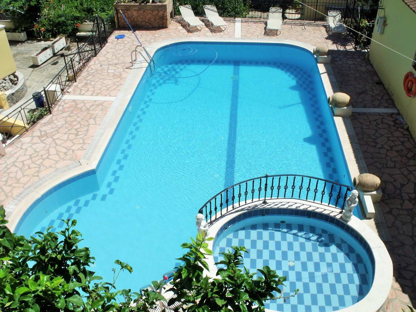 Round shaped swimming pools with sunbeds