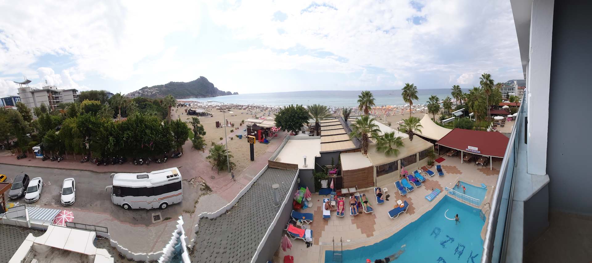 180 Grad Bildaufnahme vom Balkon des Azak Beach Hotel.