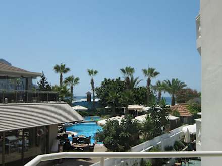 Zimmer 106 mit Blick auf die Poolanlage vom Hotel Savk